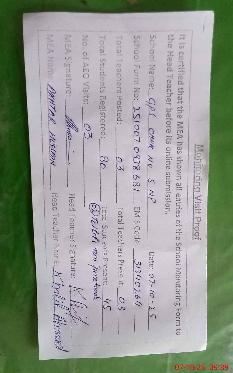 | EMIS Code: 31340264 | Name of School: GPS CHAK NO. 5 NP | |||