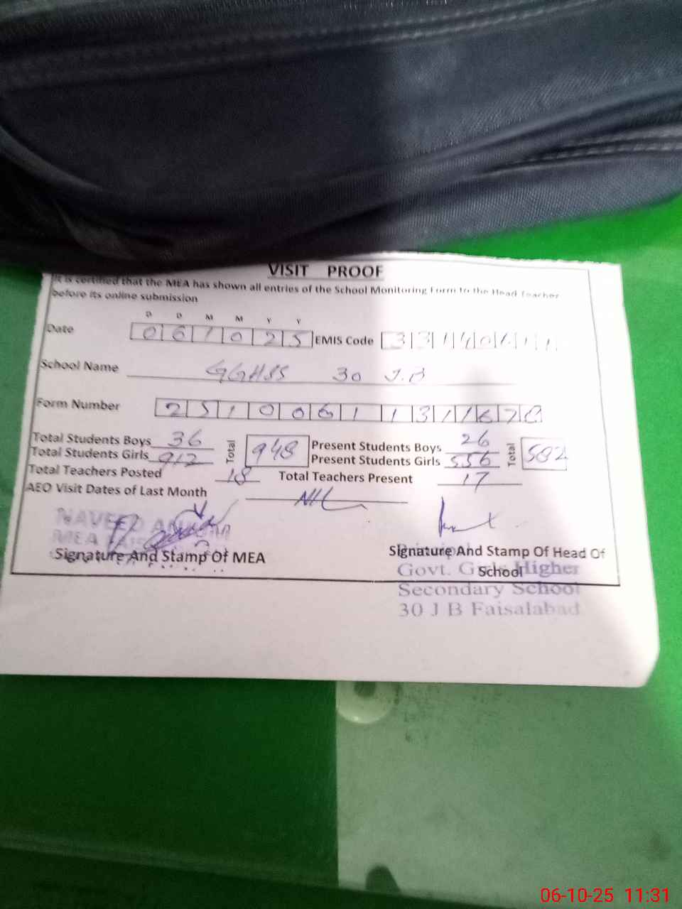 | Attendance Register | Head Teacher | MEA with School | Visit Proof |