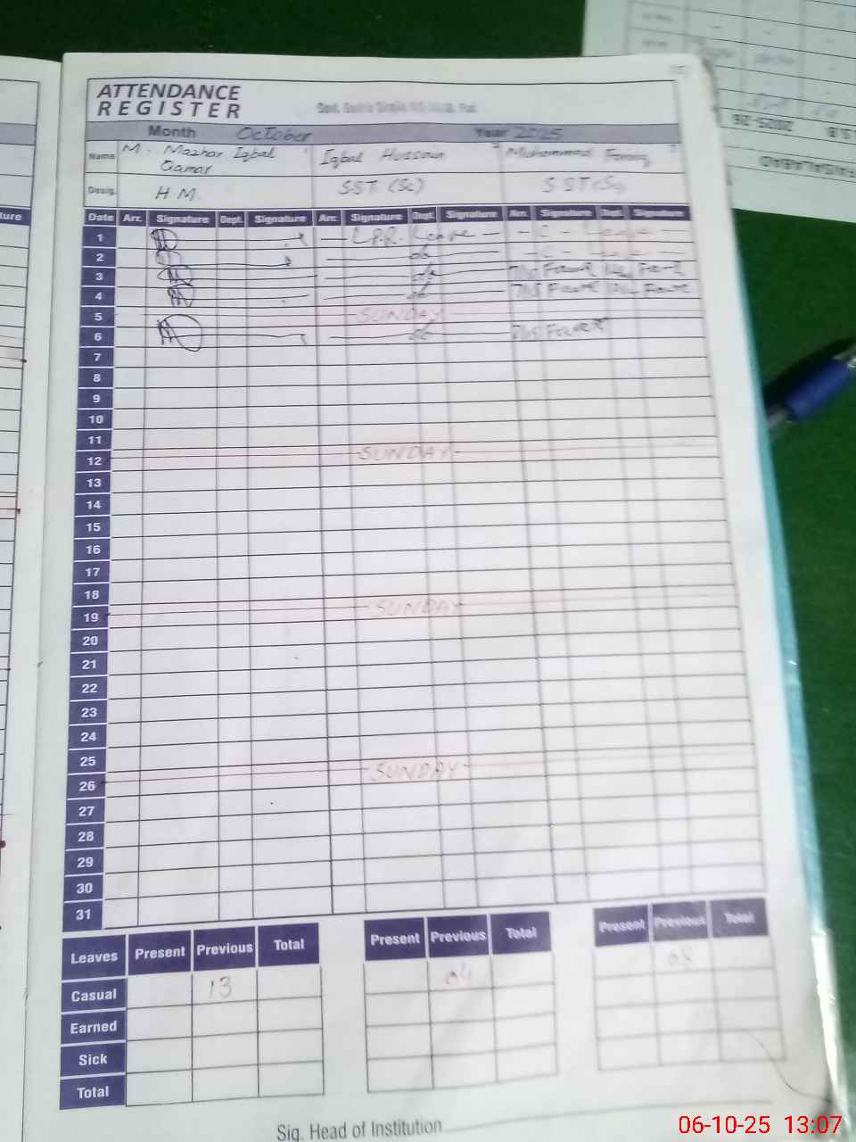 | CNIC | Full Name | Designation | R/C | Absence During Last Calender Month |
