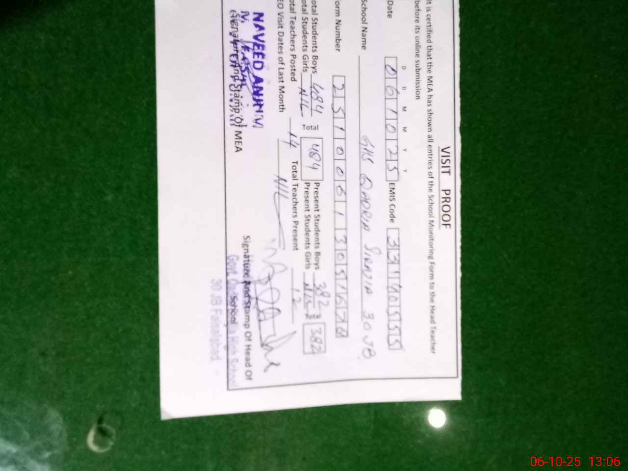 | Certified that this School was Inspected by the Undersigned MEA/DMO Today and the Information Stated Above is as Per Record. | |||||
