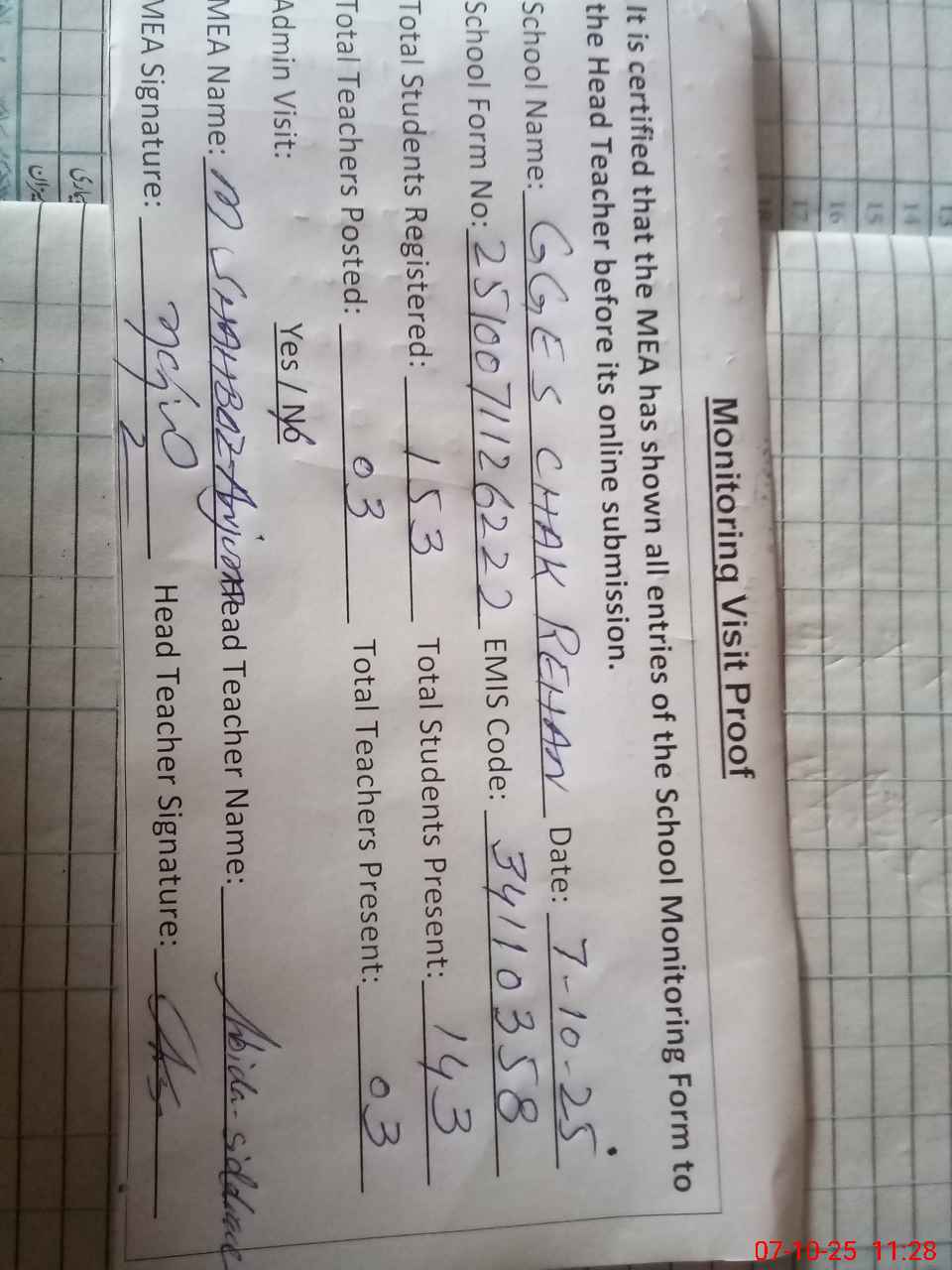 | EMIS Code: 34110358 | Name of School: GGES CHAK REHAN | |||