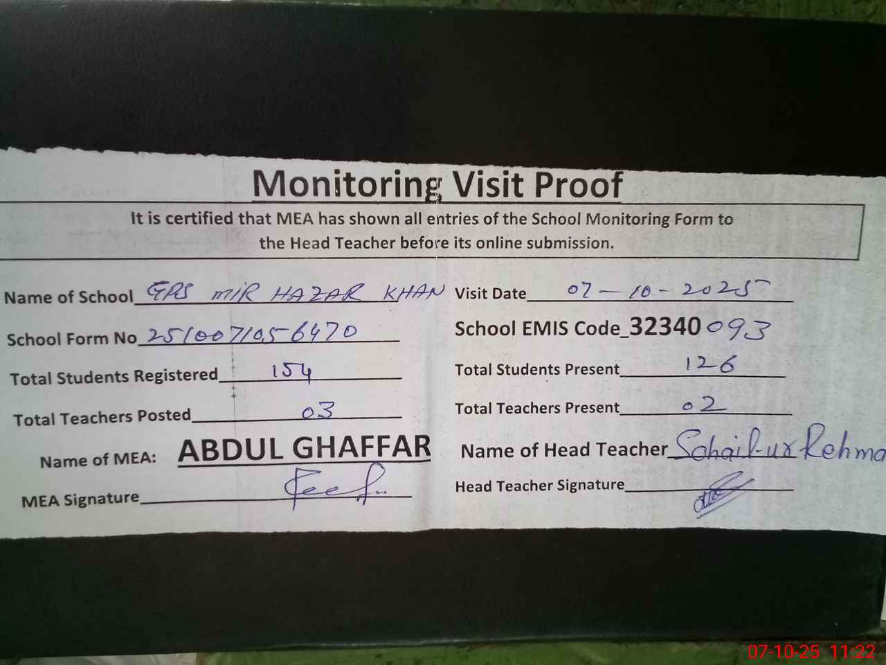 | Attendance Register | Head Teacher | MEA with School | Visit Proof |