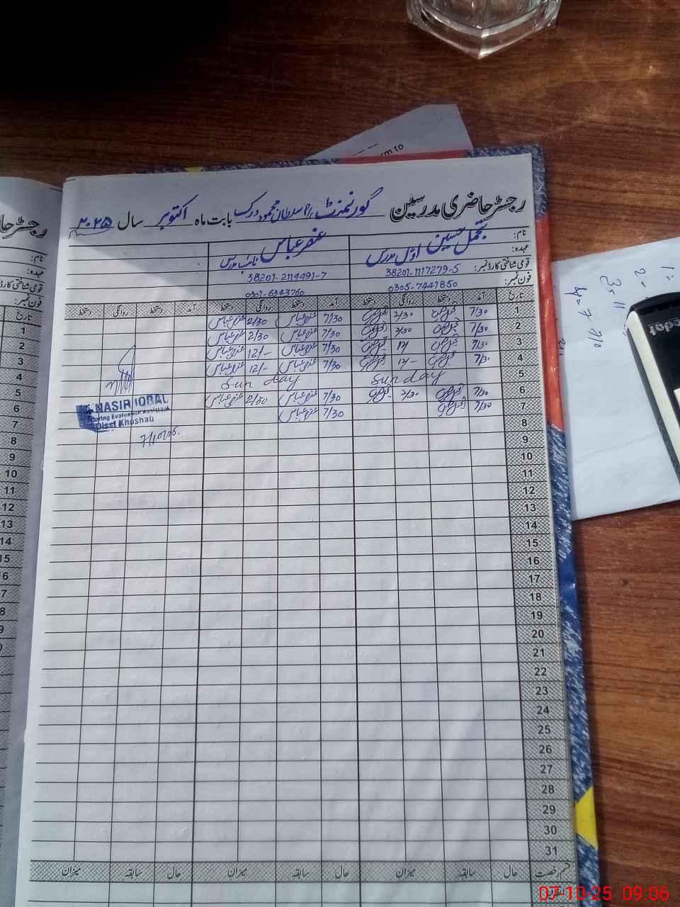 | CNIC | Full Name | Designation | R/C | Absence during last cal. month |