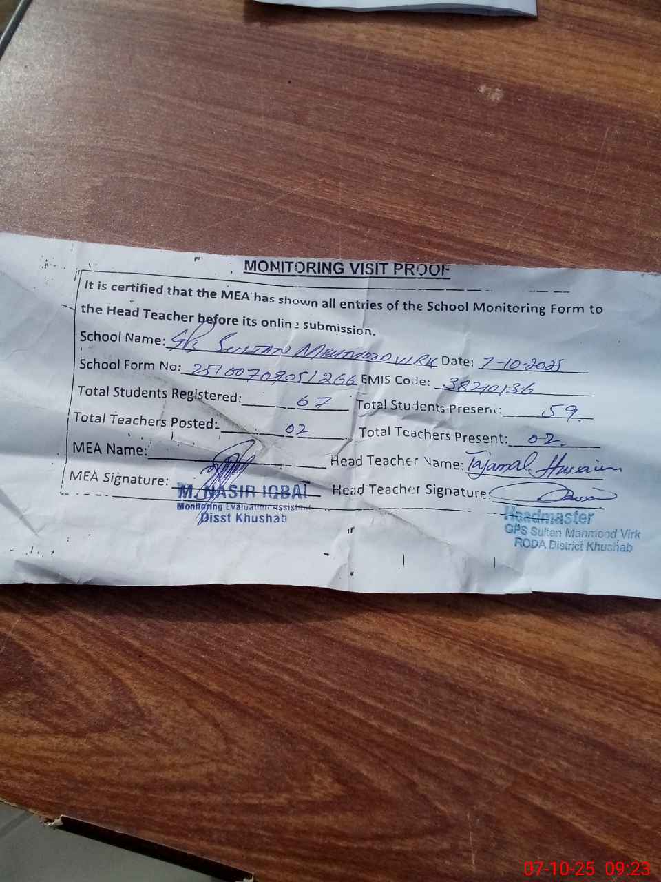 | EMIS Code: 38210136 | Name of School: GPS SULTAN MEHMOOD VIRK | |||