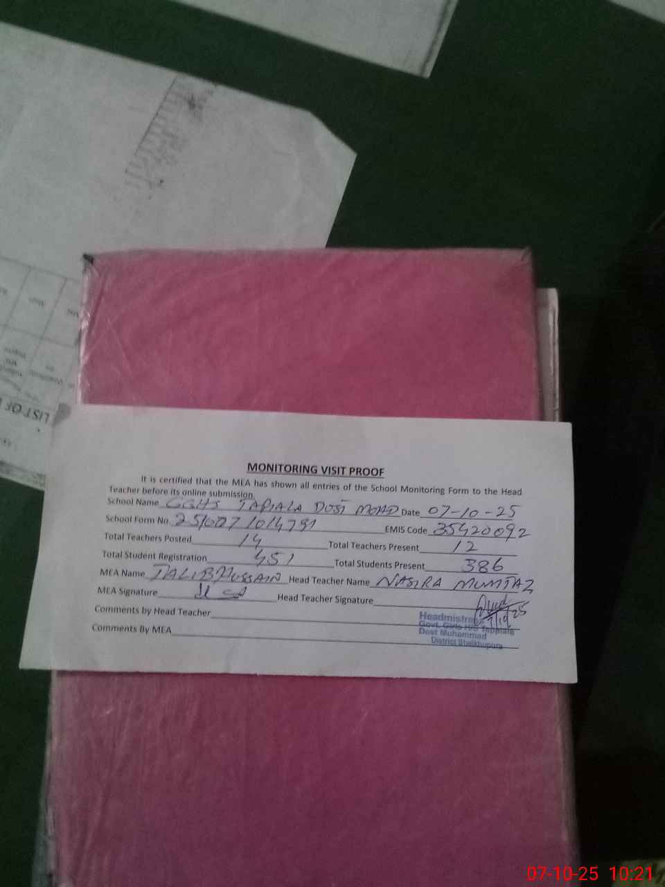 | Certified that this School was Inspected by the Undersigned MEA/DMO Today and the Information Stated Above is as Per Record. | |||||