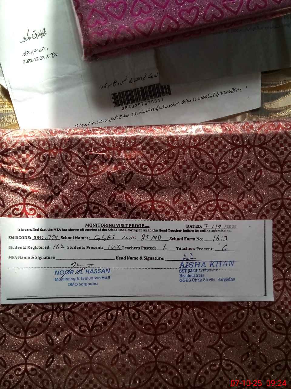 | Certified that this School was Inspected by the Undersigned MEA/DMO Today and the Information Stated Above is as Per Record. | |||||