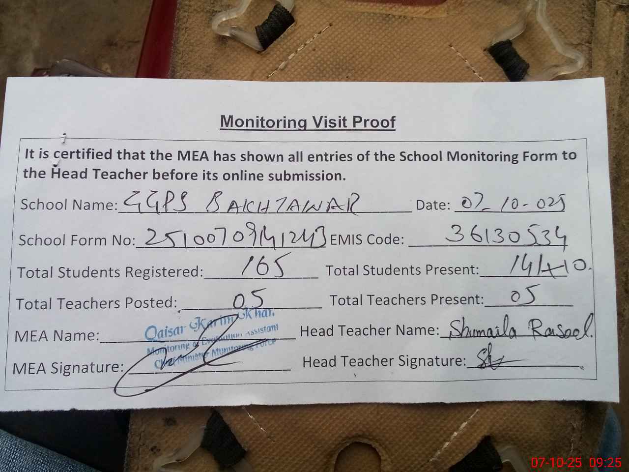 | Monitoring Date: 07-10-2025 | Start Time: 07-10-2025 08:54 AM | End Time: 07-10-2025 09:25 AM | Name of MEA: Qa**** Ka**** Kh**** | |