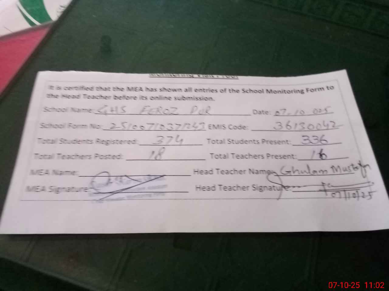 | Attendance Register | Head Teacher | MEA with School | Visit Proof |