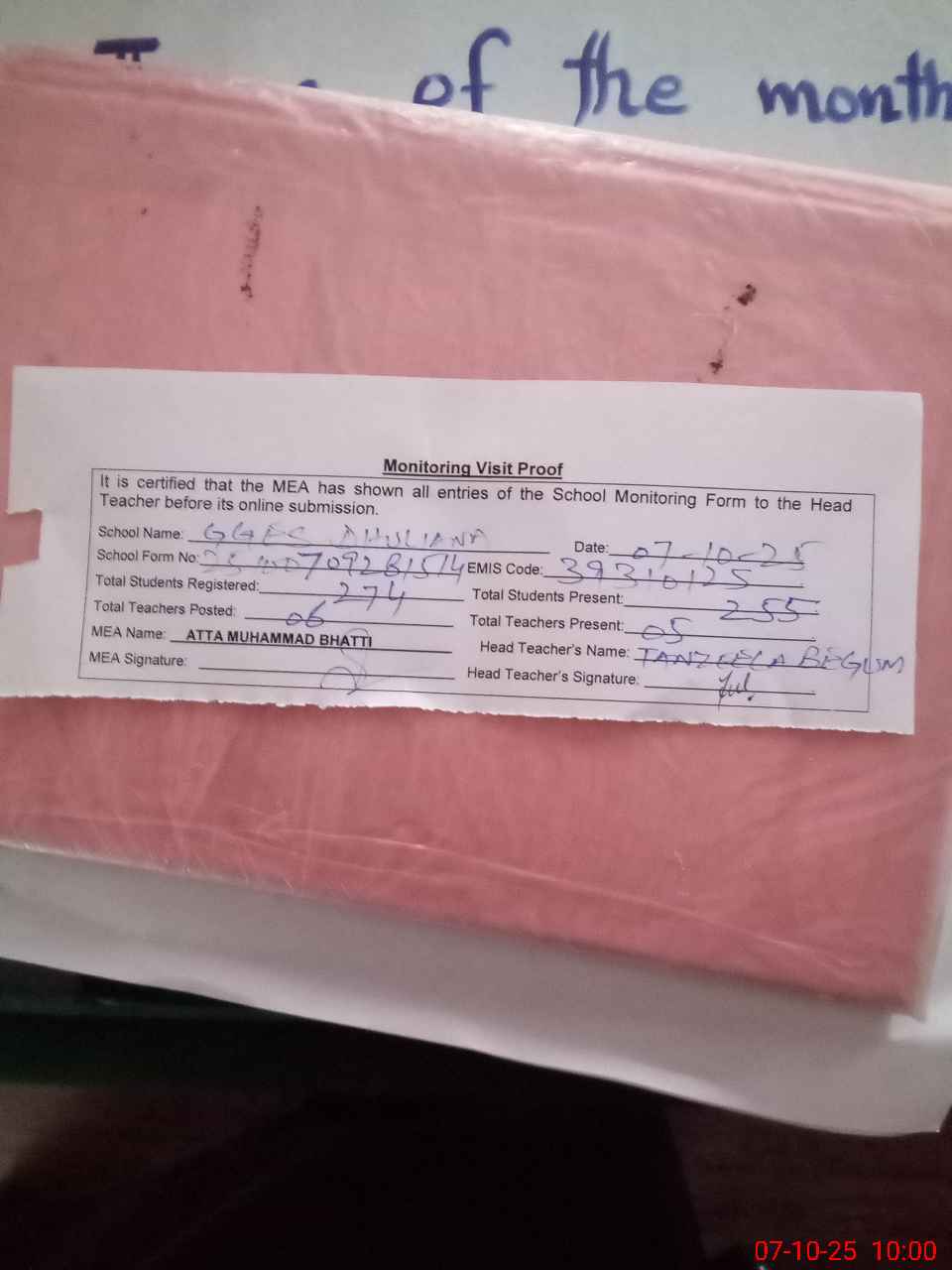 | Certified that this School was Inspected by the Undersigned MEA/DMO Today and the Information Stated Above is as Per Record. | |||||