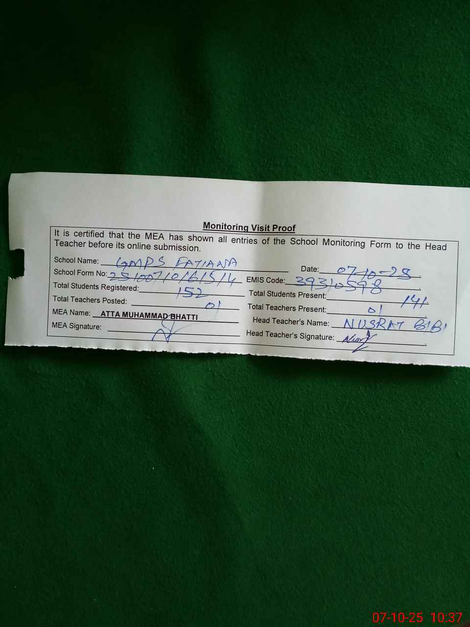 | Certified that this School was Inspected by the Undersigned MEA/DMO Today and the Information Stated Above is as Per Record. | |||||