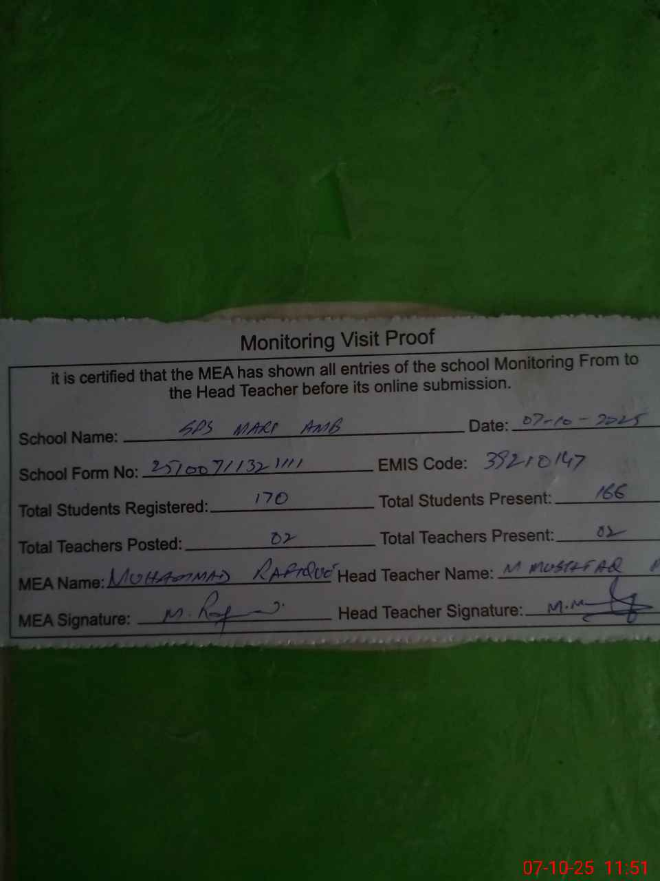 | Certified that this School was Inspected by the Undersigned MEA/DMO Today and the Information Stated Above is as Per Record. | |||||