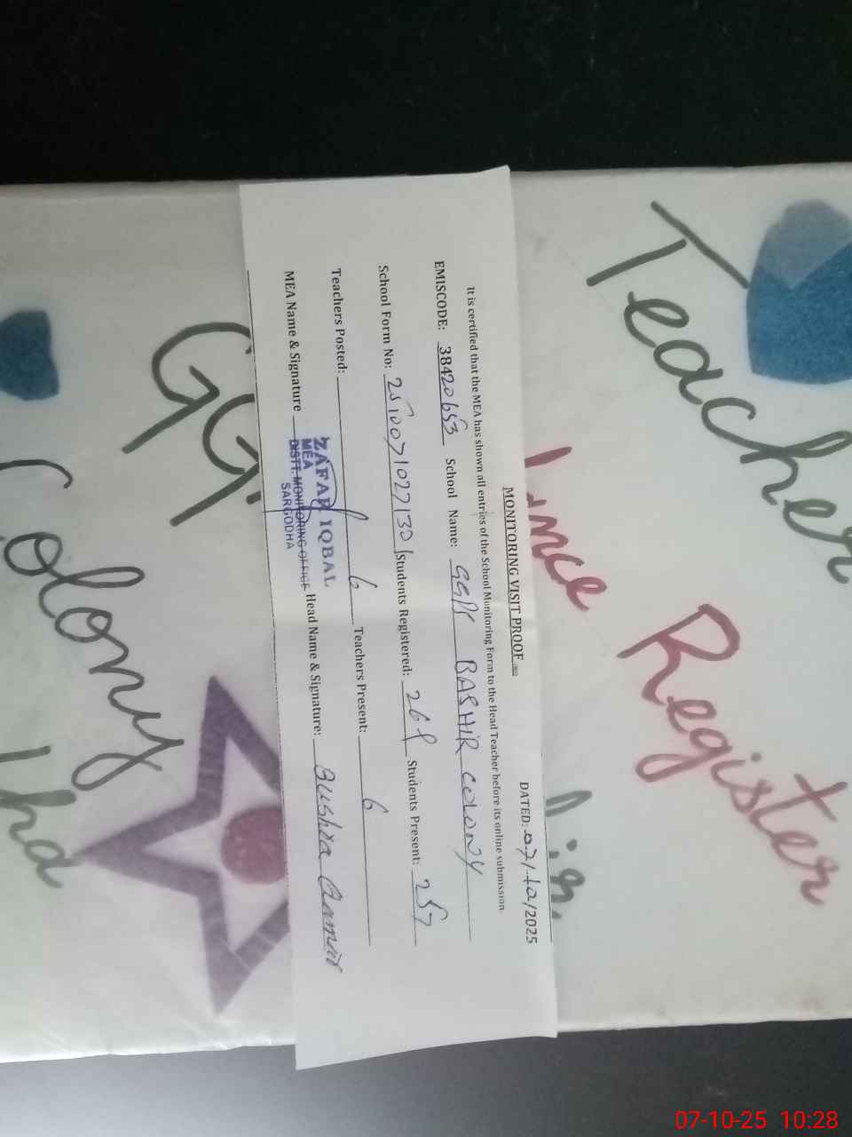 | Attendance Register | Head Teacher | MEA with School | Visit Proof |