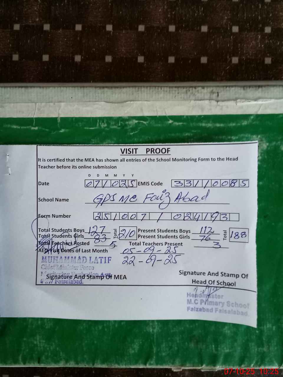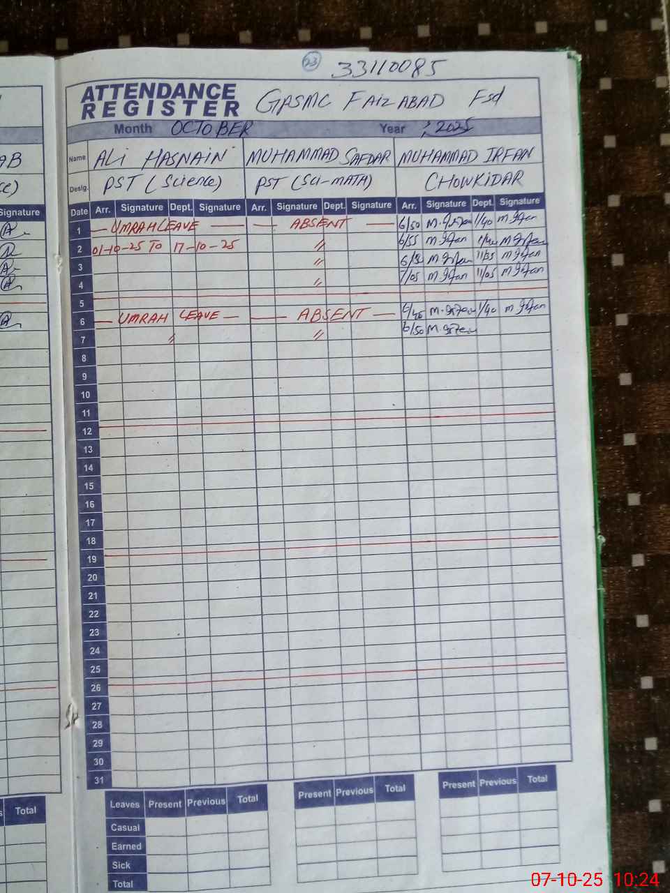 | Remarks (Use Separate Page if Required): Mr Muhammad Safdar PST absent from school since 1 September 2025 HM said he gone abroad | |||||