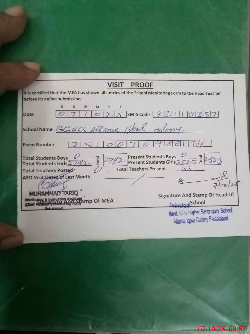 | EMIS Code: 33110357 | Name of School: GGHSS ALLAMA IQBAL COLONY FSD | |||