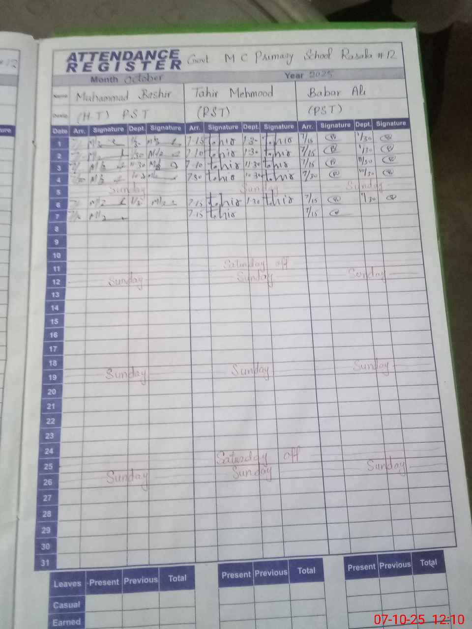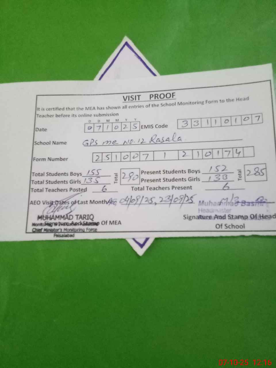 | EMIS Code: 33110107 | Name of School: GPS MC NO.12 RASALA FSD | |||