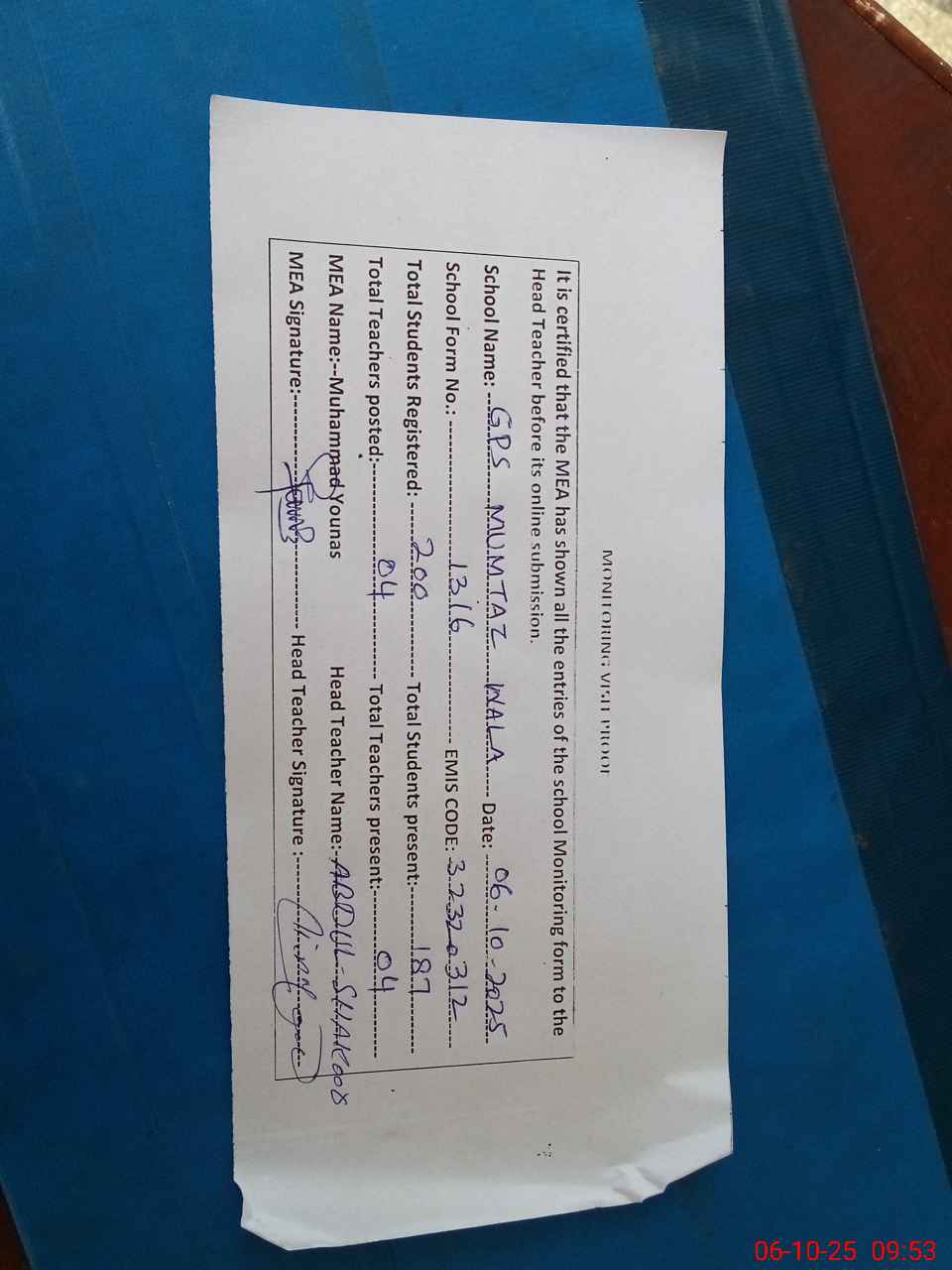| EMIS Code: 32320312 | Name of School: GPS MUMTAZ WALA | |||