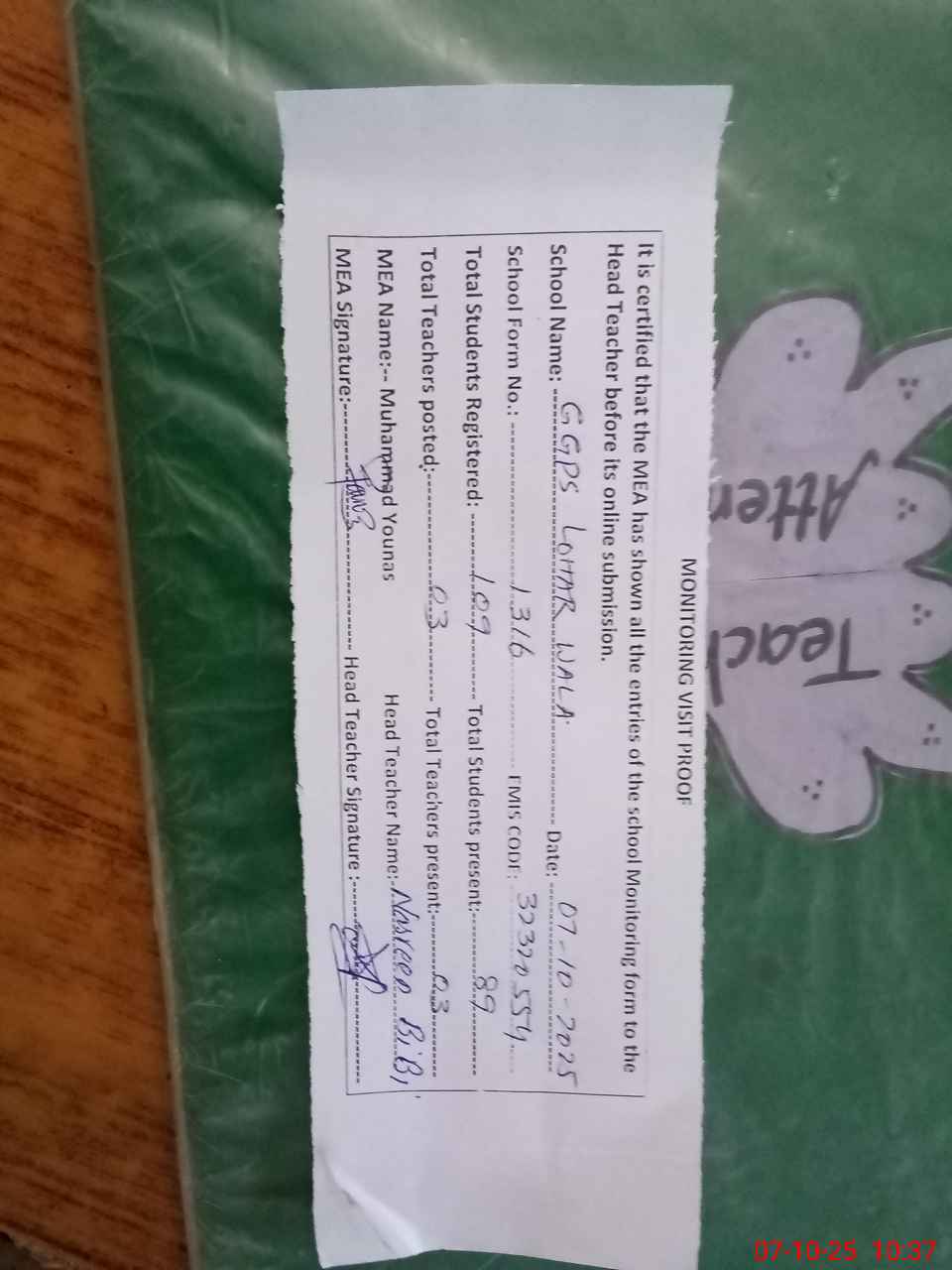 | Attendance Register | Head Teacher | MEA with School | Visit Proof |