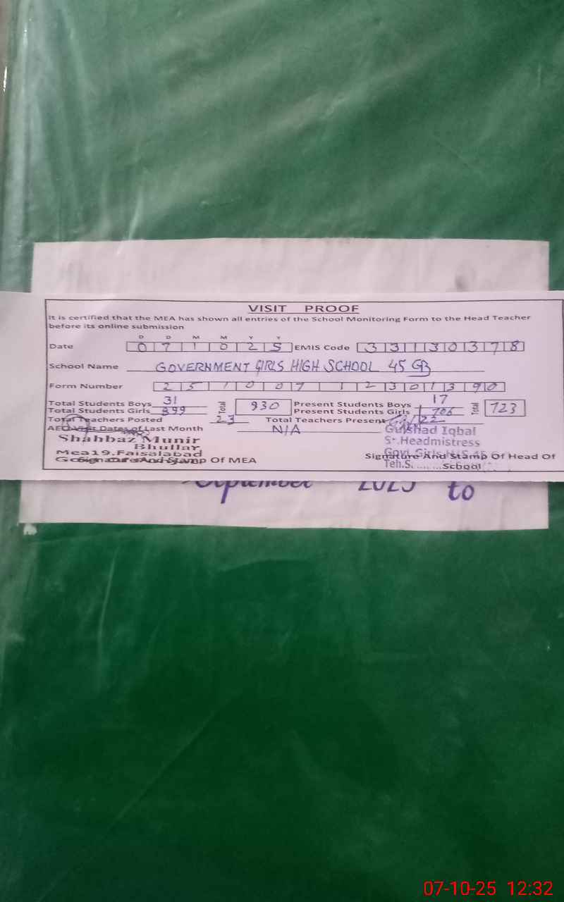 | EMIS Code: 33130378 | Name of School: GGHS CHAK NO 45 GB FSD | |||