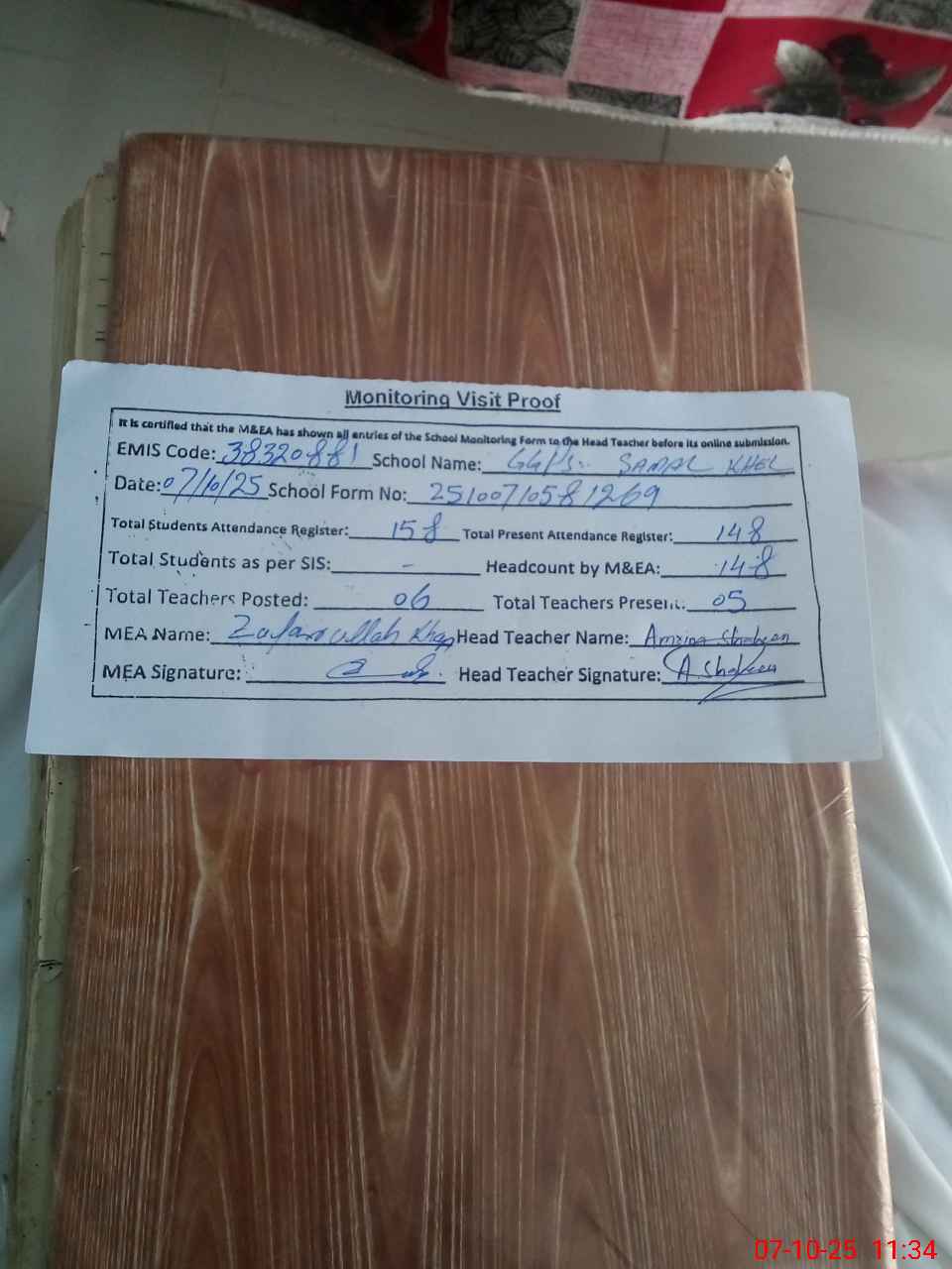 | Attendance Register | Head Teacher | MEA with School | Visit Proof |