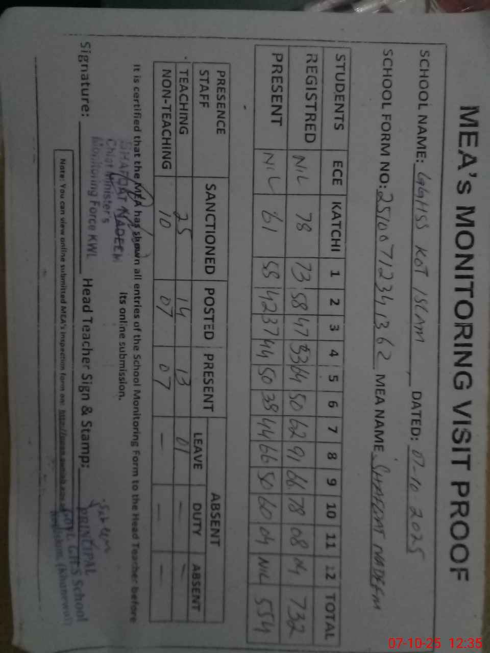 | Attendance Register | Head Teacher | MEA with School | Visit Proof |