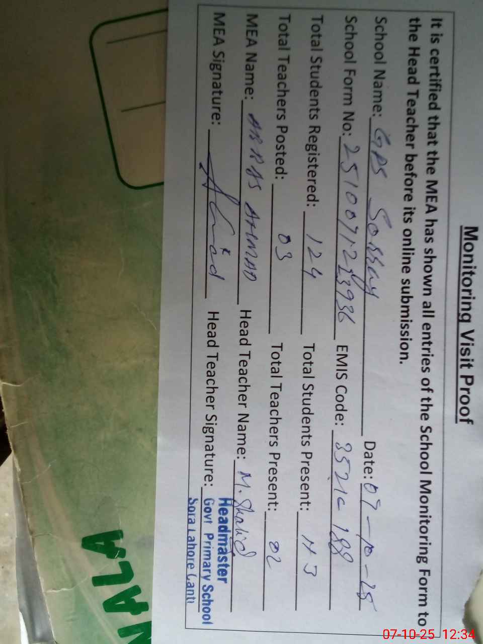 | Certified that this School was Inspected by the Undersigned MEA/DMO Today and the Information Stated Above is as Per Record. | |||||