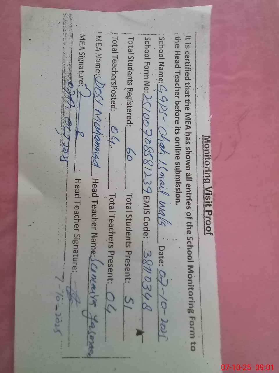 | Certified that this School was Inspected by the Undersigned MEA/DMO Today and the Information Stated Above is as Per Record. | |||||