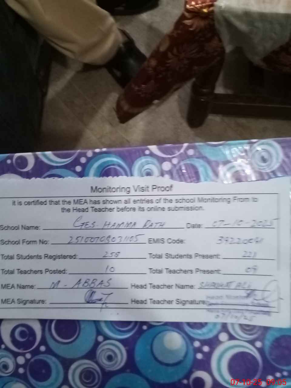 | Monitoring Date: 07-10-2025 | Start Time: 07-10-2025 08:03 AM | End Time: 07-10-2025 09:06 AM | Name of MEA: Mu**** Ab**** | |