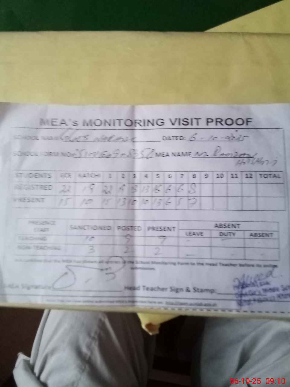 | Attendance Register | Head Teacher | MEA with School | Visit Proof |