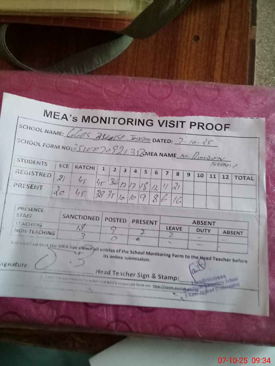 | Certified that this School was Inspected by the Undersigned MEA/DMO Today and the Information Stated Above is as Per Record. | |||||