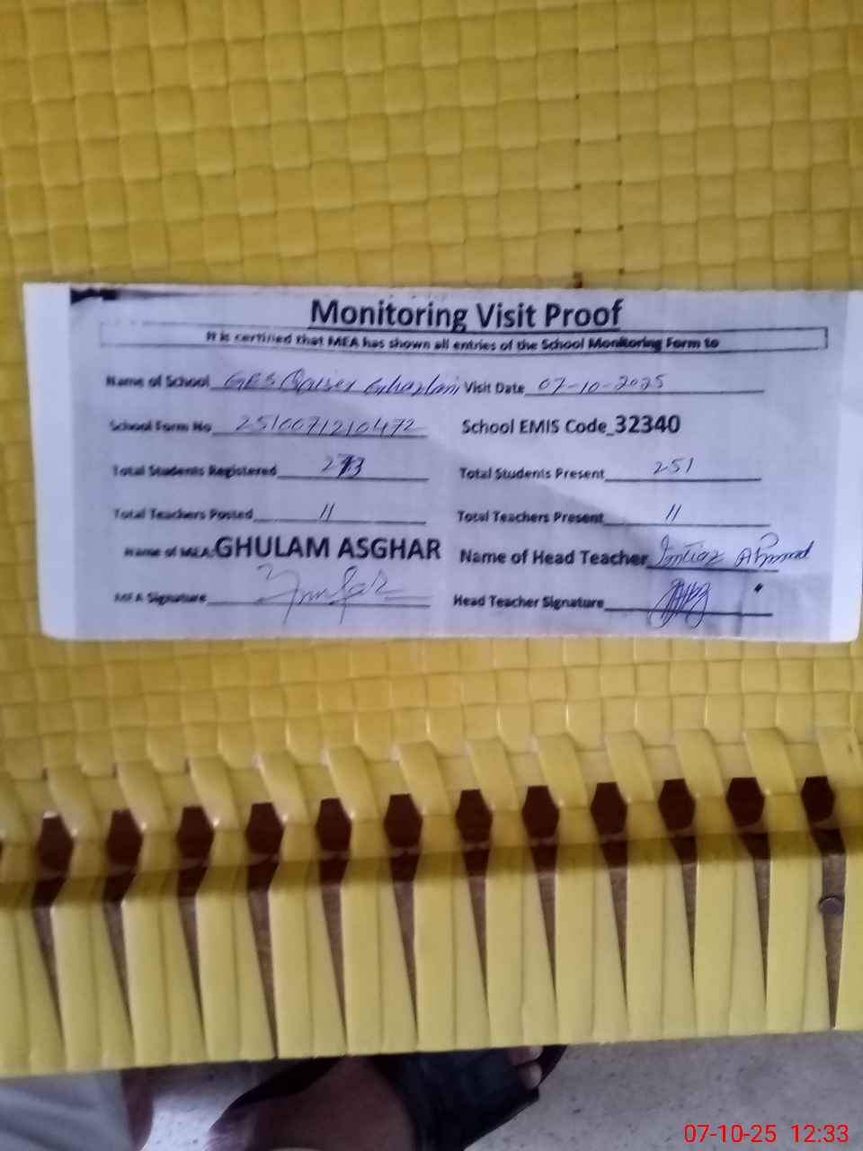 | Attendance Register | Head Teacher | MEA with School | Visit Proof |