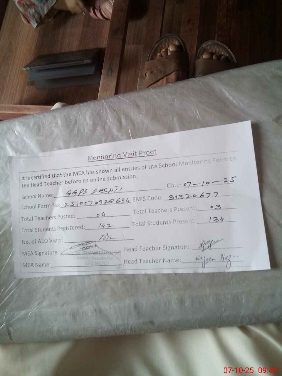 | Monitoring Date: 07-10-2025 | Start Time: 07-10-2025 09:27 AM | End Time: 07-10-2025 09:49 AM | Name of MEA: Mu**** Sa**** Ul**** Sa**** | |