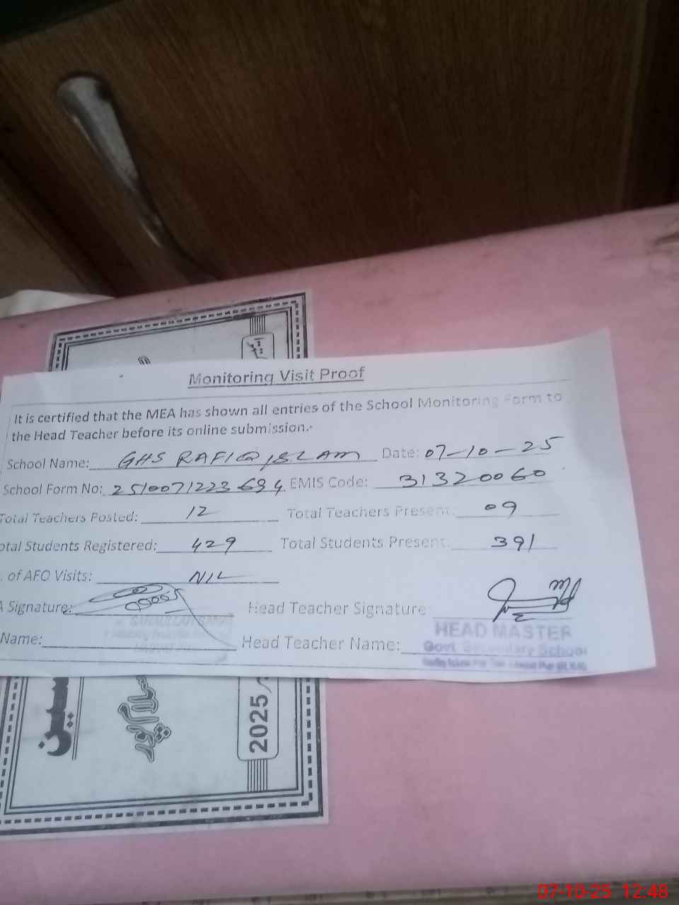 | Certified that this School was Inspected by the Undersigned MEA/DMO Today and the Information Stated Above is as Per Record. | |||||