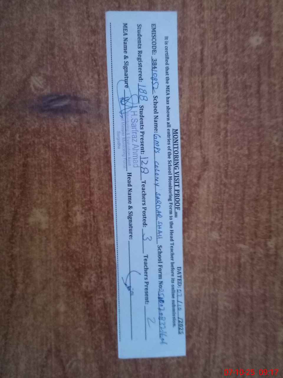 | EMIS Code: 38410852 | Name of School: GMPS COLONY SARDAR SHAH | |||