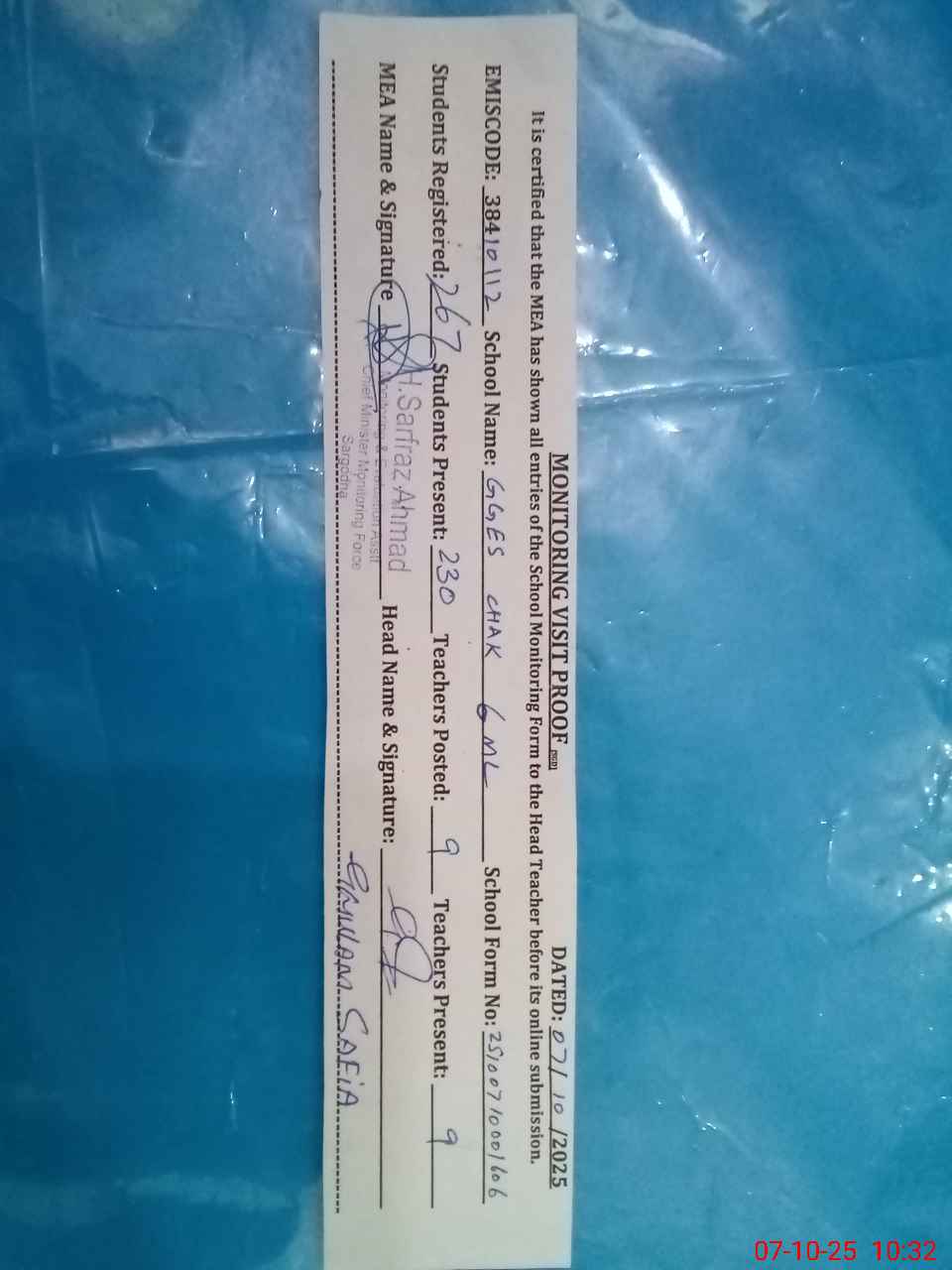 | Certified that this School was Inspected by the Undersigned MEA/DMO Today and the Information Stated Above is as Per Record. | |||||