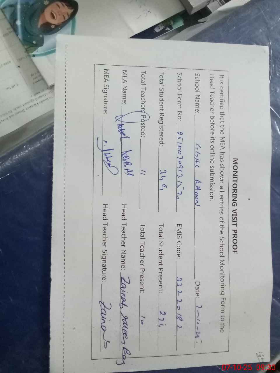 | Attendance Register | Head Teacher | MEA with School | Visit Proof |
