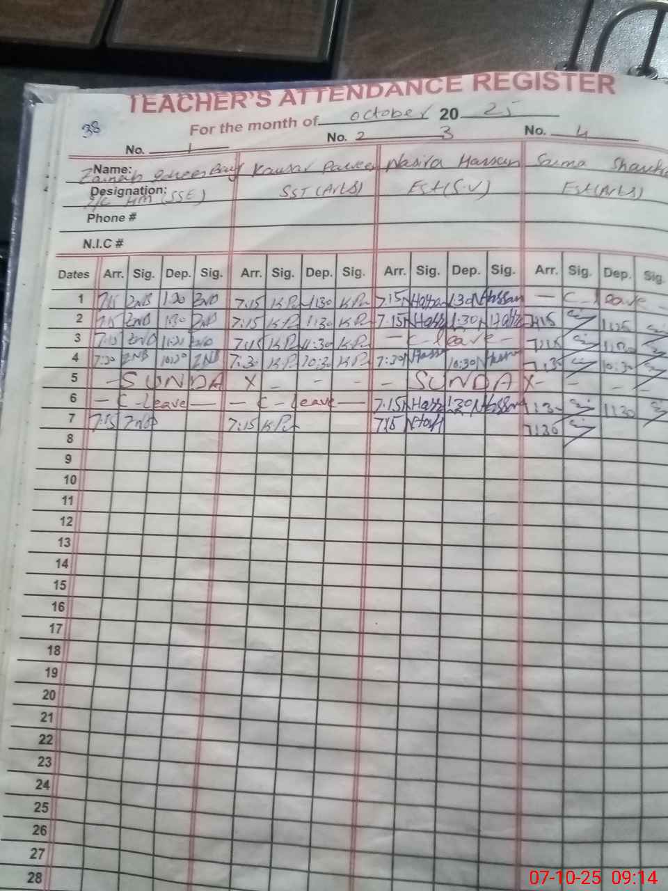 | CNIC | Full Name | Designation | R/C | Absence During Last Calender Month |