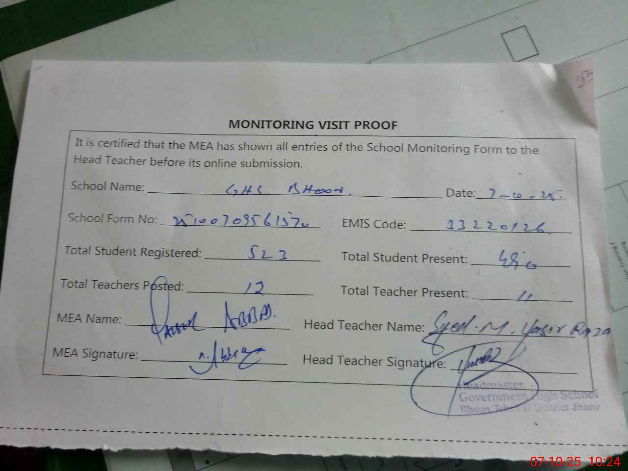 | Certified that this School was Inspected by the Undersigned MEA/DMO Today and the Information Stated Above is as Per Record. | |||||