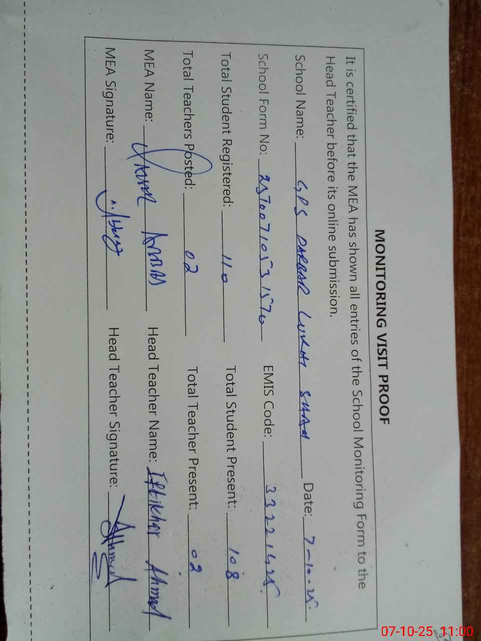| Attendance Register | Head Teacher | MEA with School | Visit Proof |