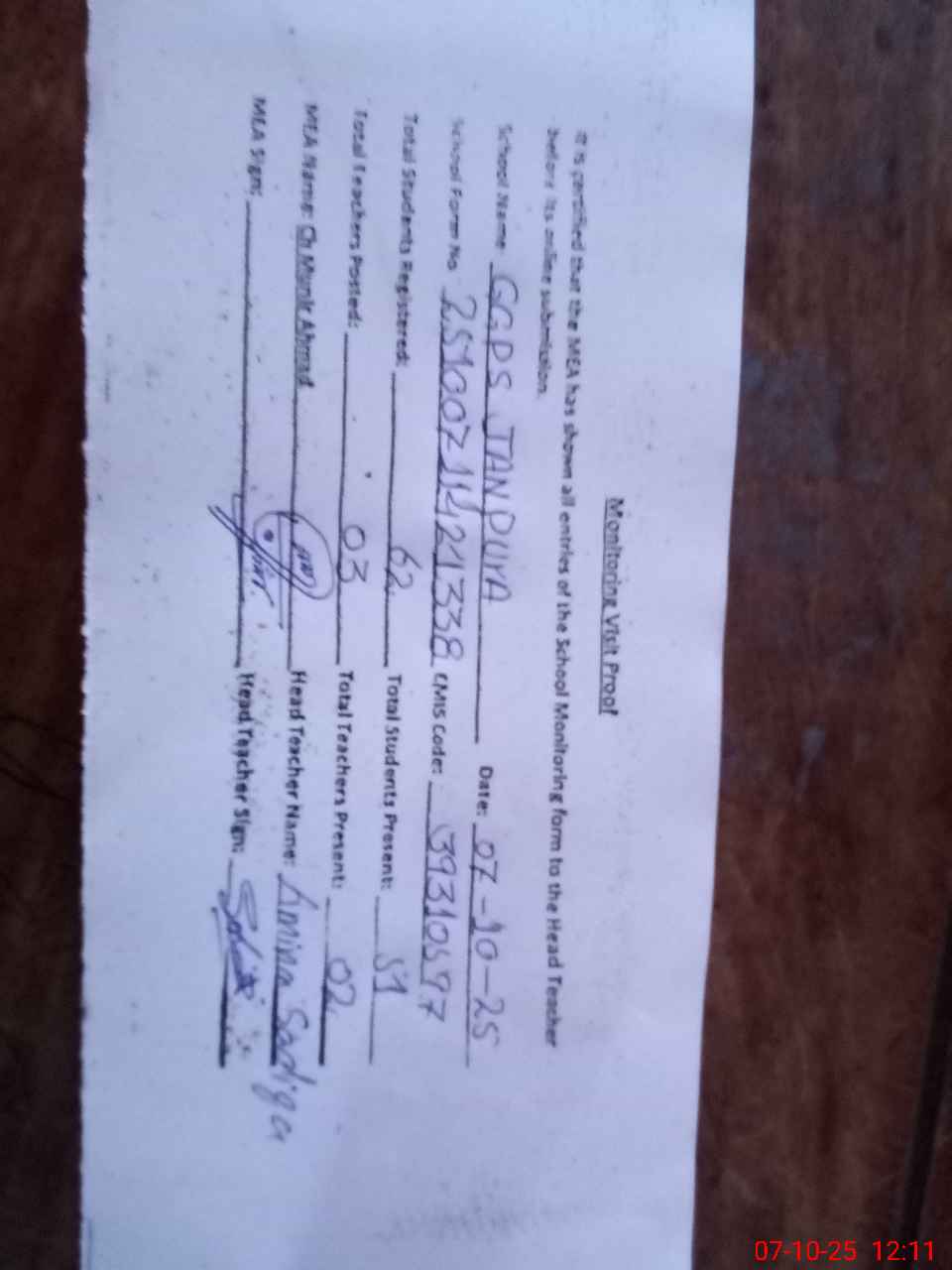 | Certified that this School was Inspected by the Undersigned MEA/DMO Today and the Information Stated Above is as Per Record. | |||||