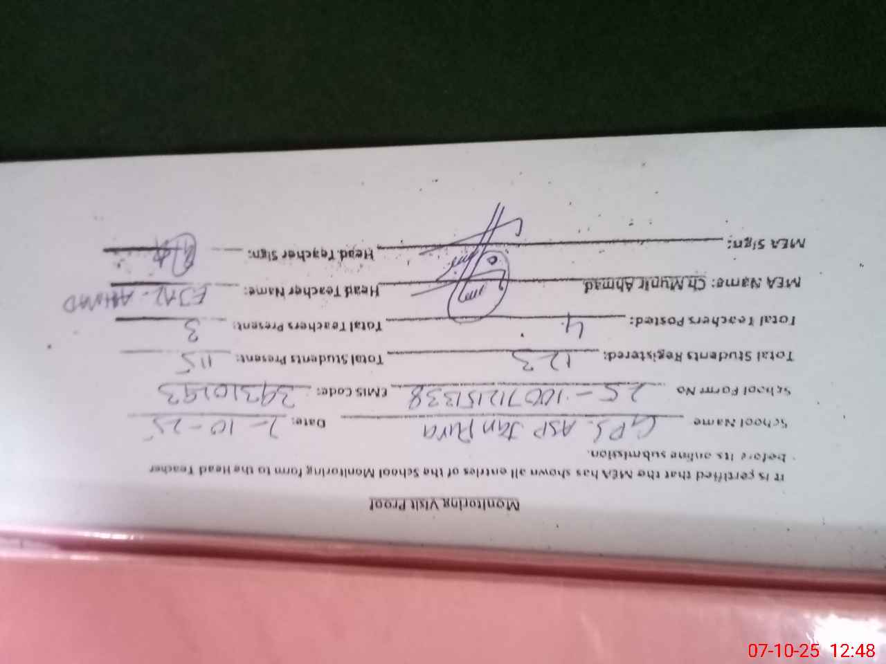 | Monitoring Date: 07-10-2025 | Start Time: 07-10-2025 12:15 PM | End Time: 07-10-2025 12:49 PM | Name of MEA: MU**** AH**** | |