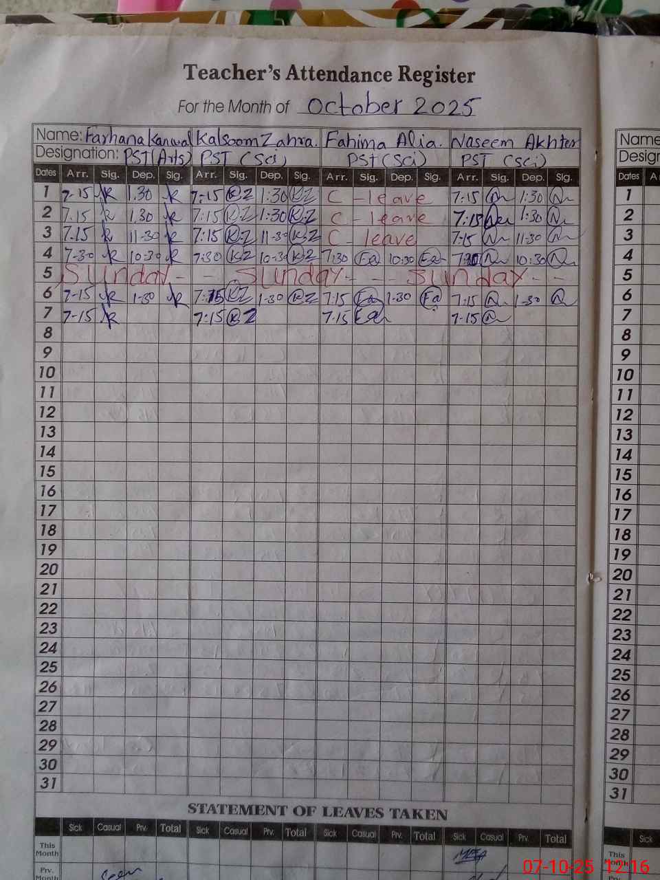 | Leave | Duty | Absent | Maternity | Medical | Ex- Pak |