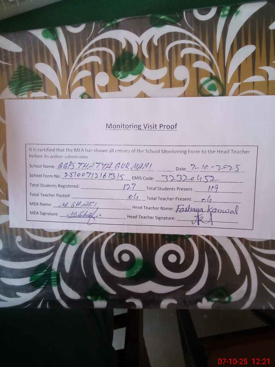 | EMIS Code: 32320452 | Name of School: GGPS THATTA GURMANI | |||