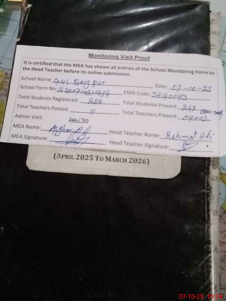 | Attendance Register | Head Teacher | MEA with School | Visit Proof |