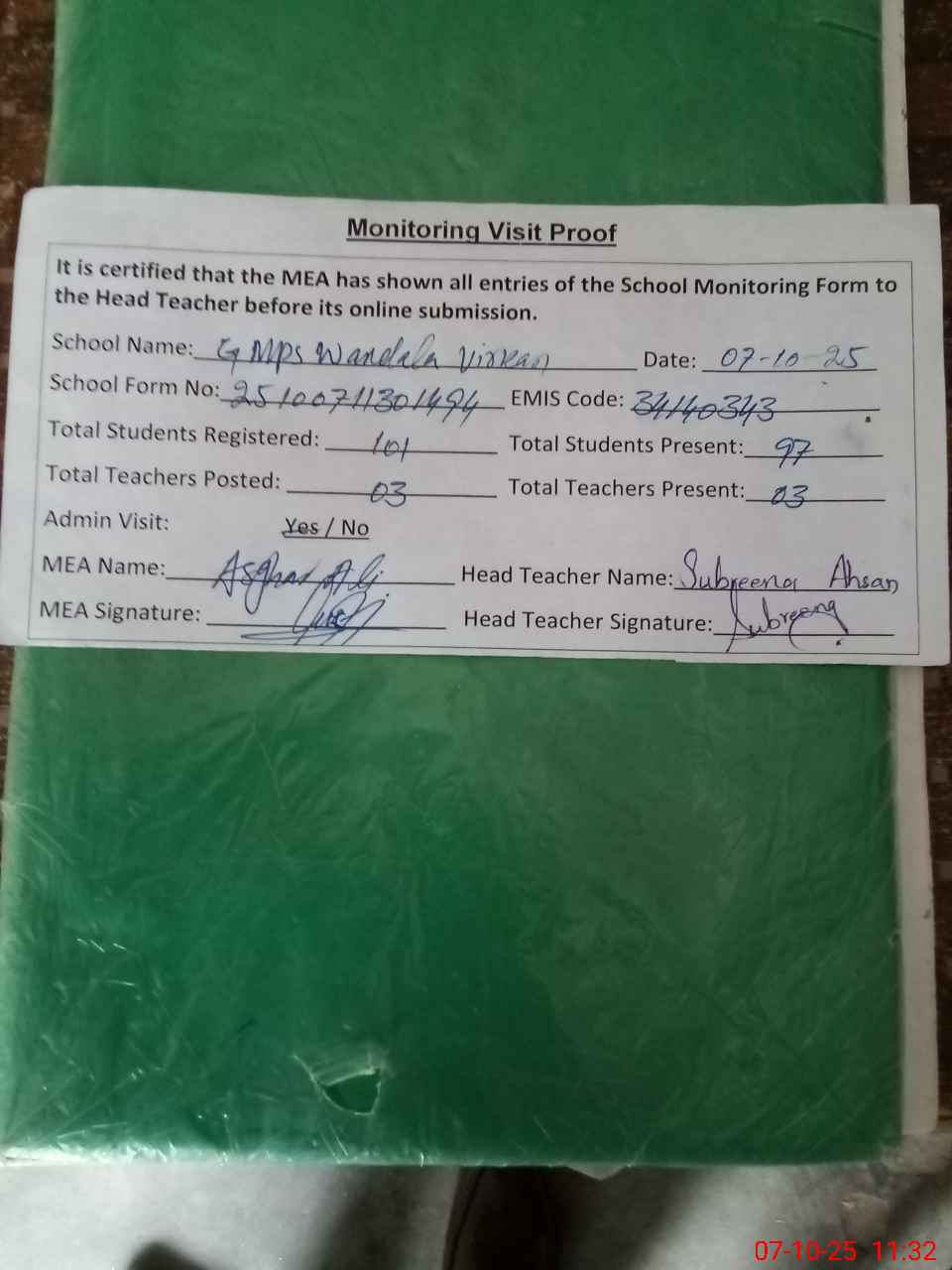| Attendance Register | Head Teacher | MEA with School | Visit Proof |