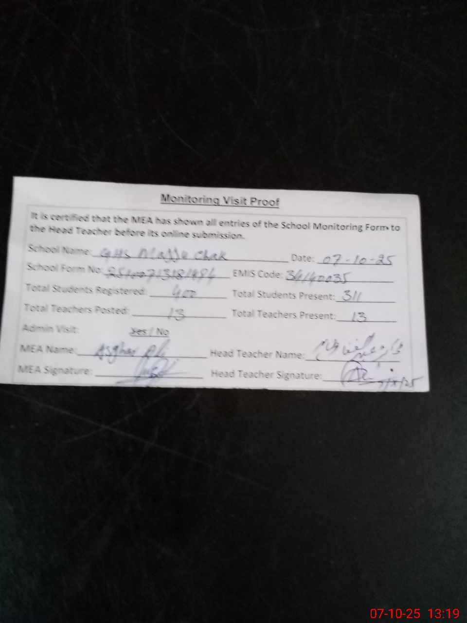 | Attendance Register | Head Teacher | MEA with School | Visit Proof |