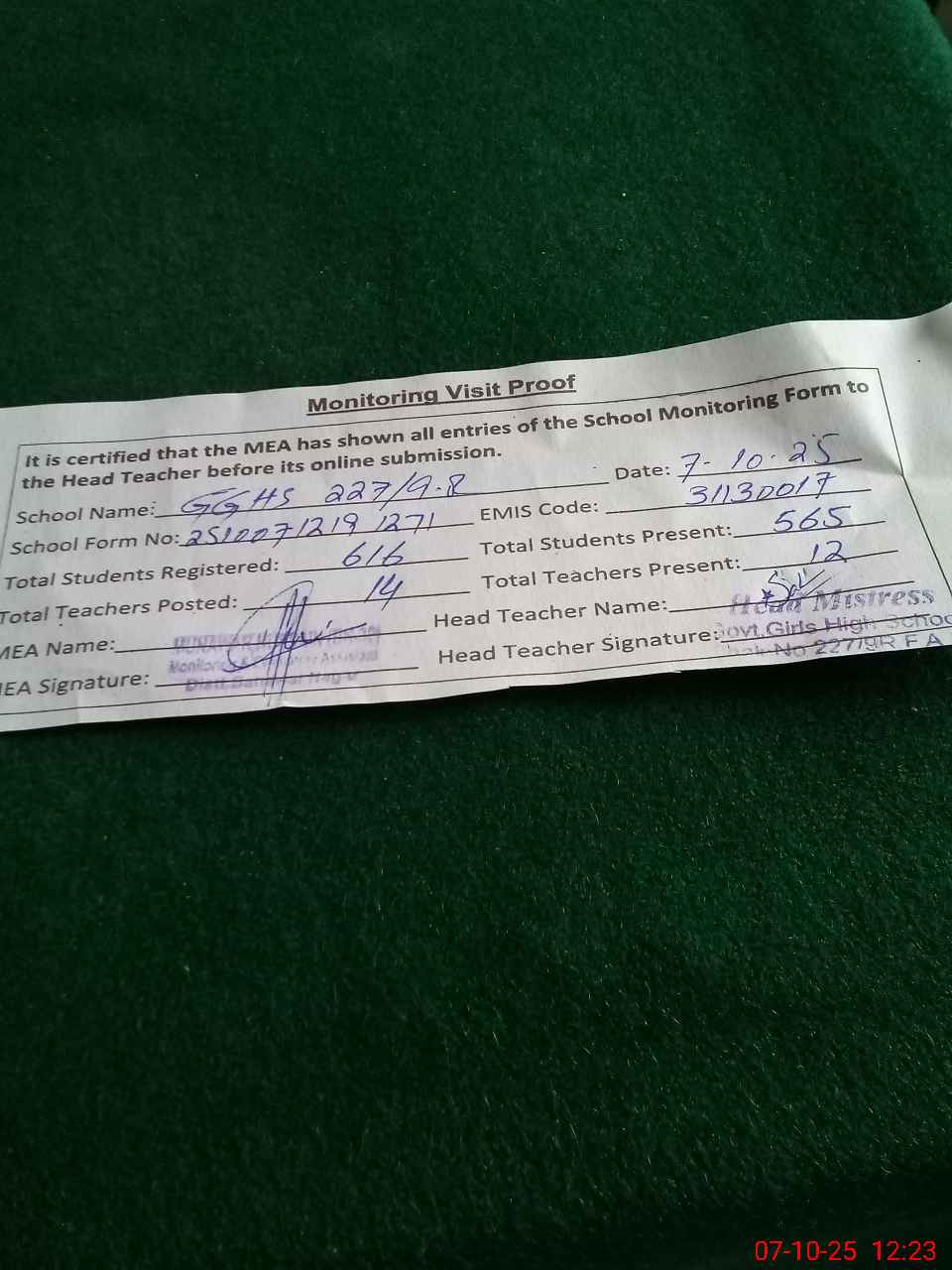 | Attendance Register | Head Teacher | MEA with School | Visit Proof |