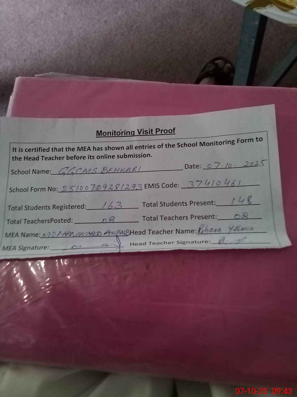 | EMIS Code: 37410461 | Name of School: GGCMS BEHKARI | |||