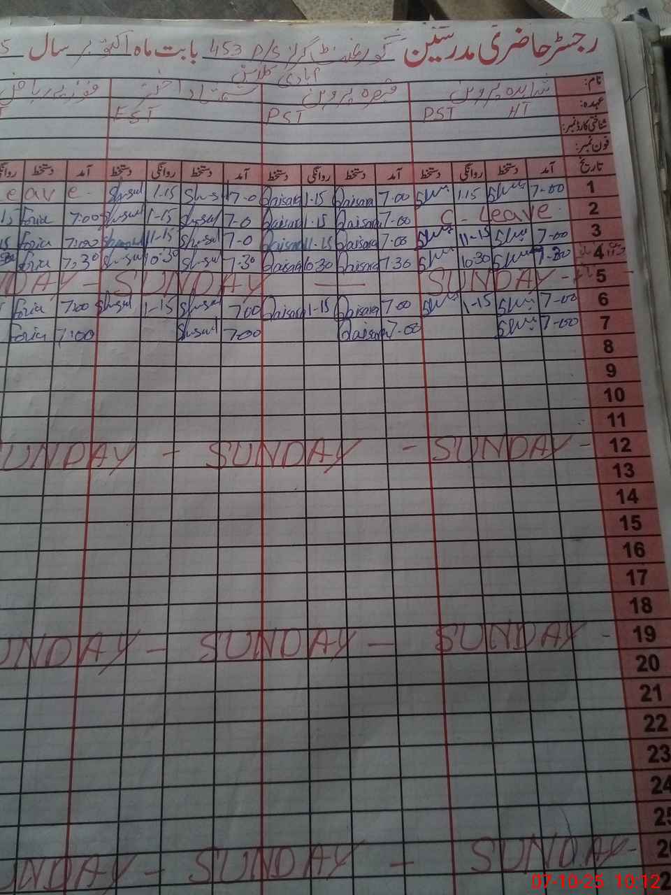 | CNIC | Full Name | Designation | R/C | Absence During Last Calender Month |