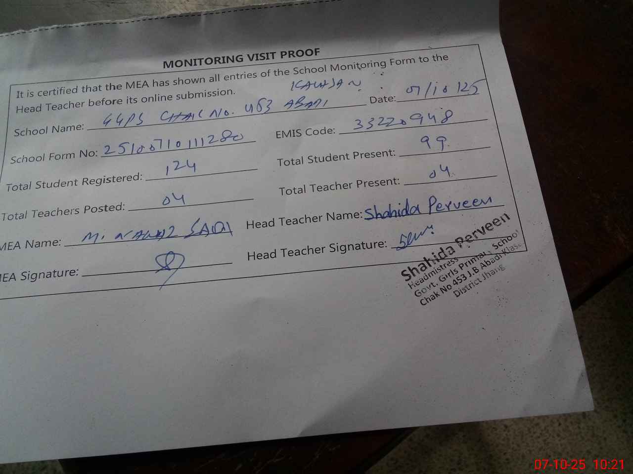 | Attendance Register | Head Teacher | MEA with School | Visit Proof |