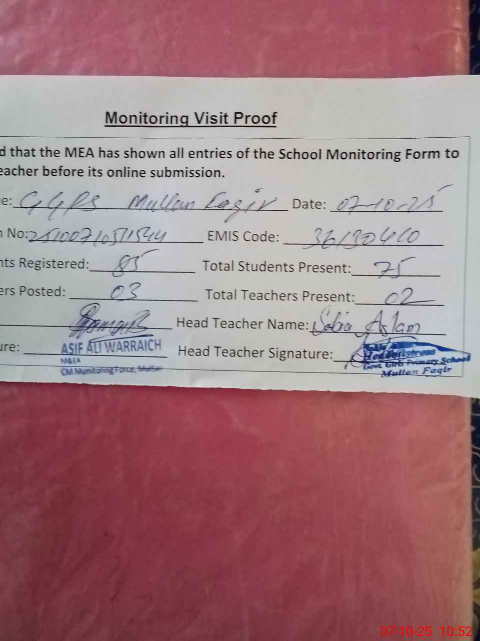 | Attendance Register | Head Teacher | MEA with School | Visit Proof |